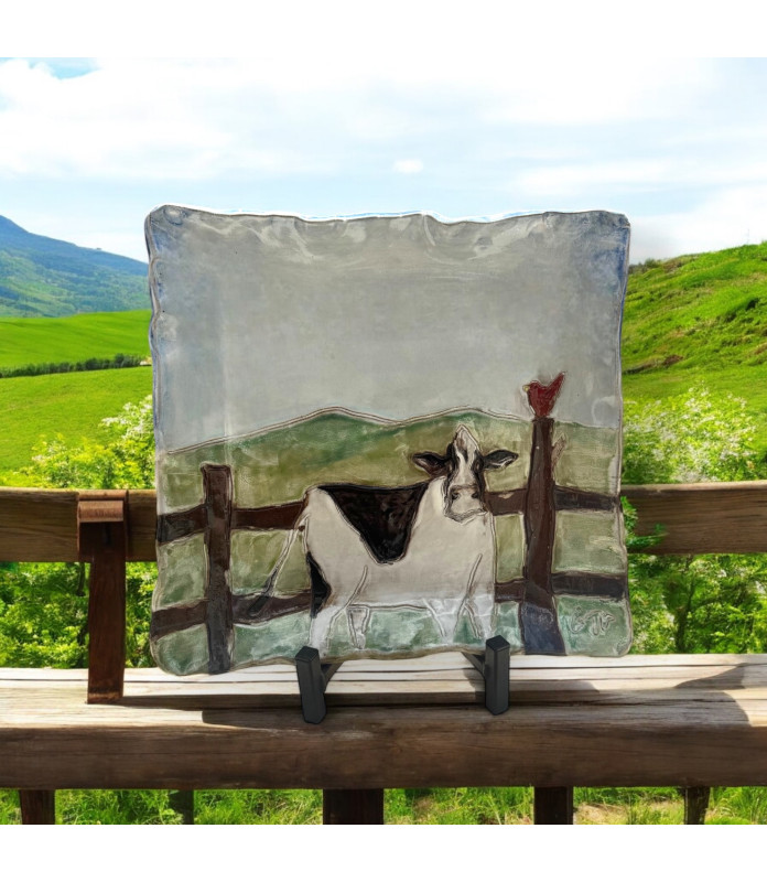 Add a touch of rustic charm to your home with the Holstein Cow 13" x 13" Tray from Dixie Pottery. This handcrafted ceramic tray features a beautifully detailed Holstein cow design, capturing the essence of farmhouse elegance. Measuring 13 inches square, it's perfect for serving appetizers, desserts, or as a decorative centerpiece. The tray's sturdy construction ensures durability, while its artistic design adds a unique flair to any setting.